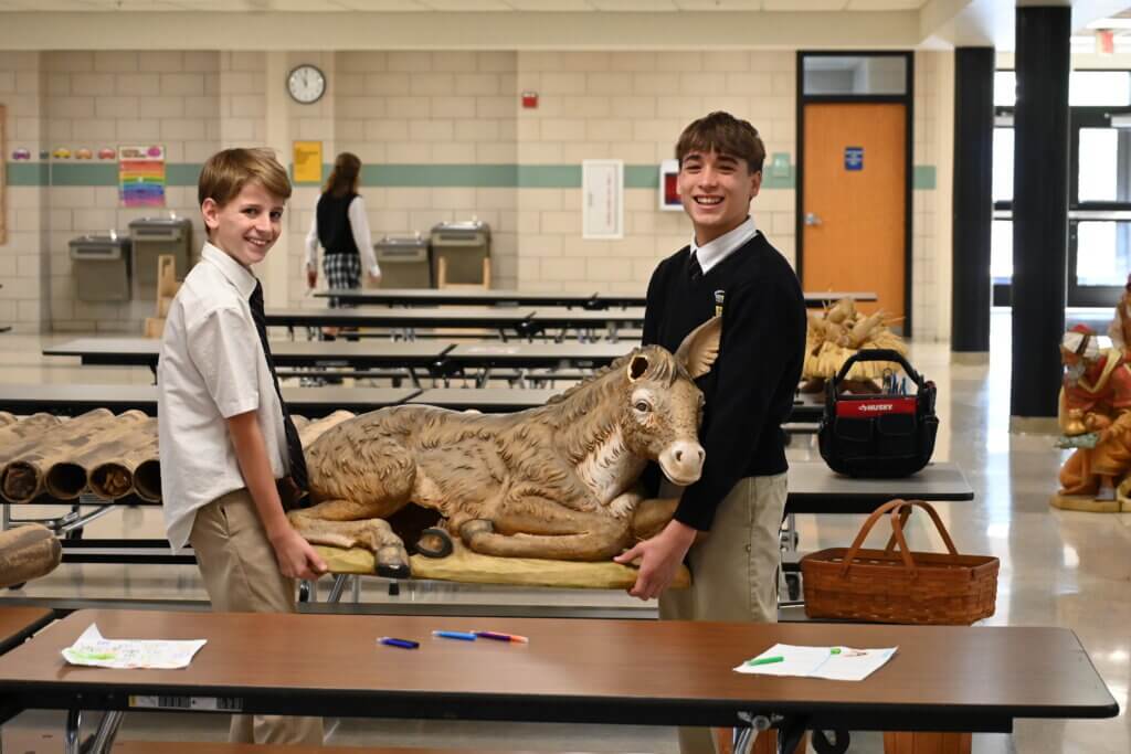 The eighth-grade class exercises leadership within the academy building throughout the year in a number of ways – from organizing field day to the Living Stations of the Cross and more. They are also responsible for working together with Mr. Cross to set up the life-sized Nativity scene in the academy commons. The scene helps the Advent season come to life for Mountaineers as they contemplate the Nativity and eagerly away the placement of Baby Jesus in the manger on Christmas.