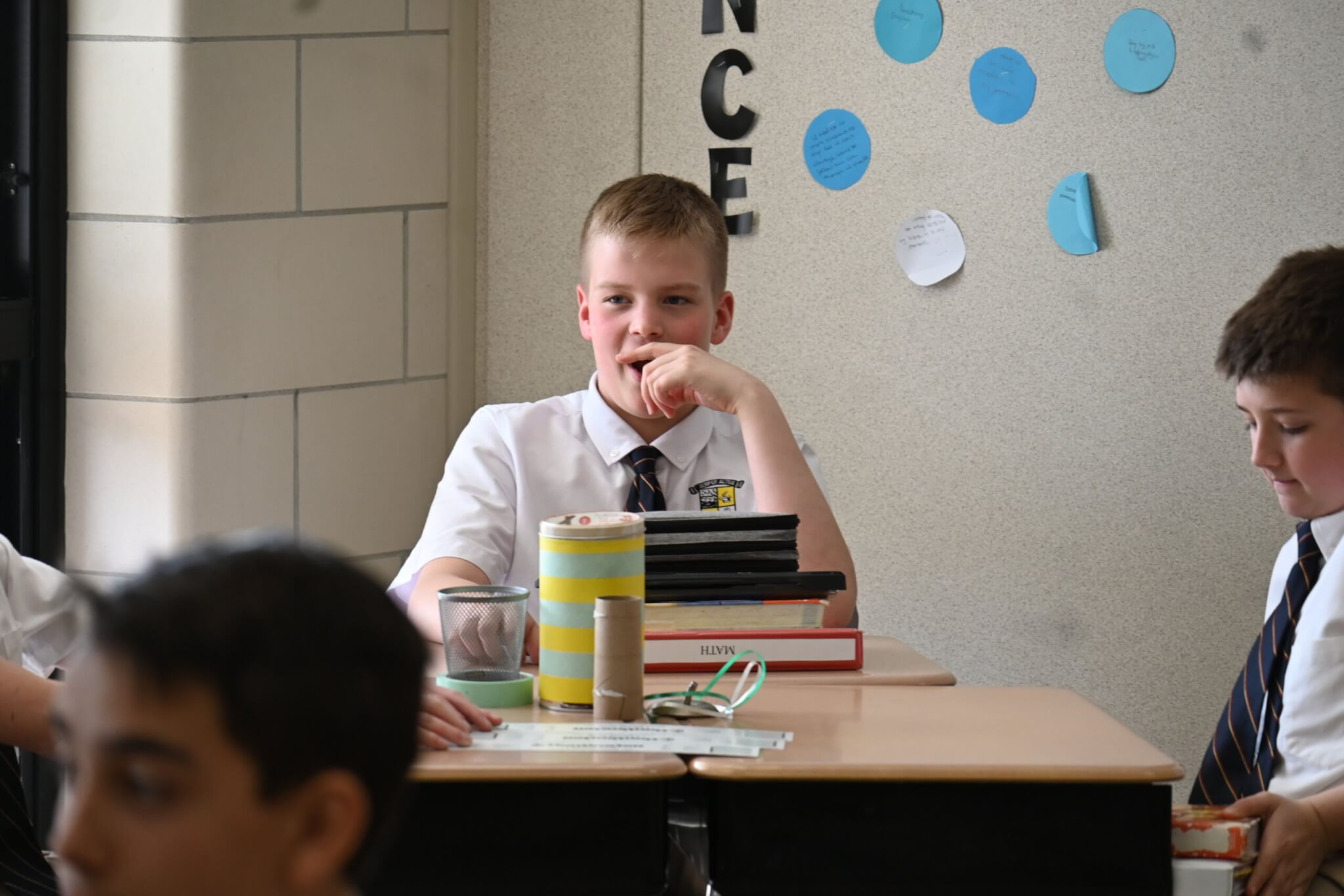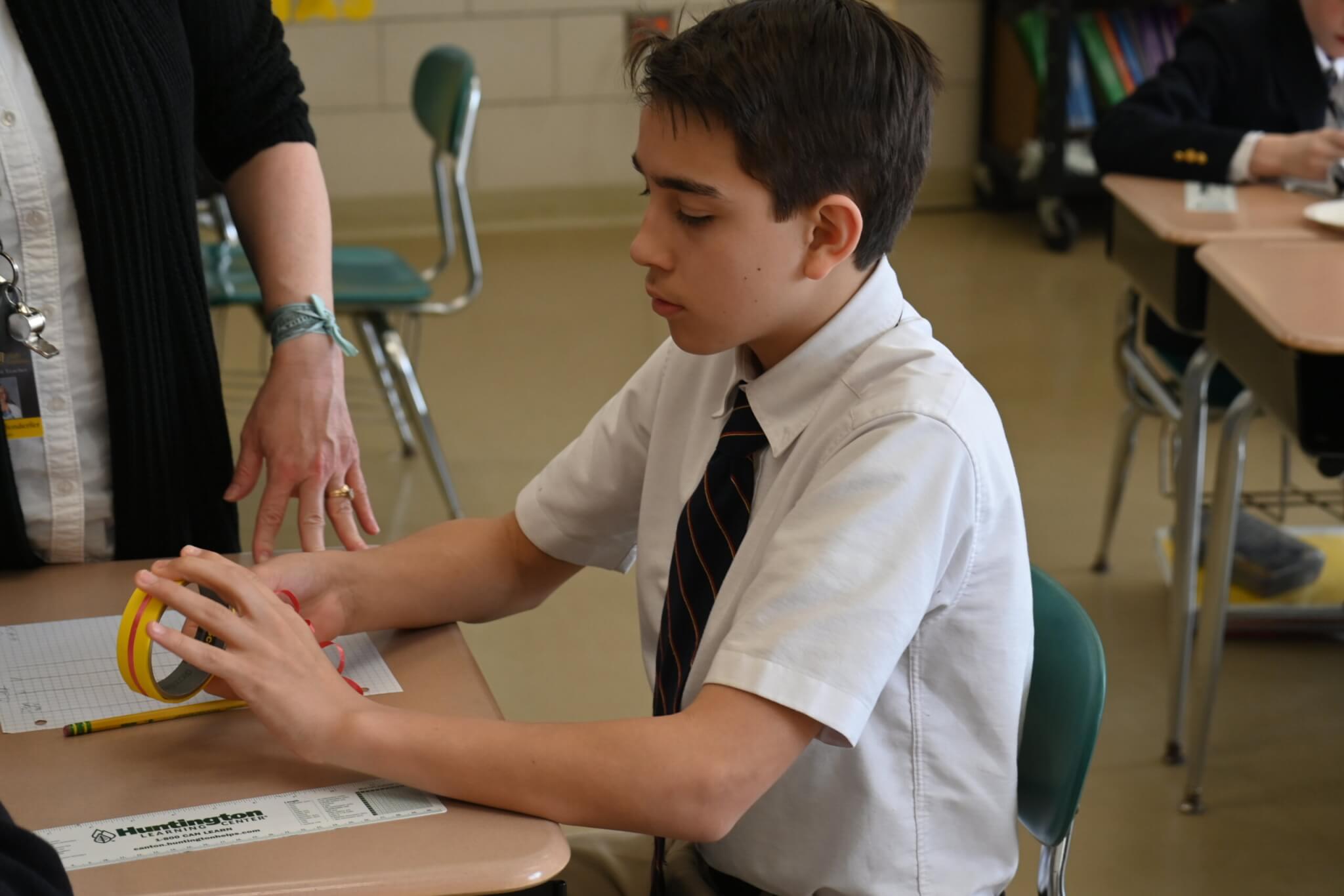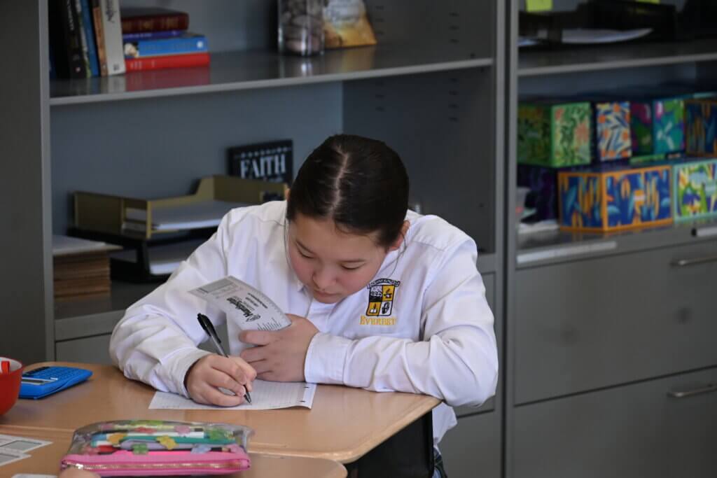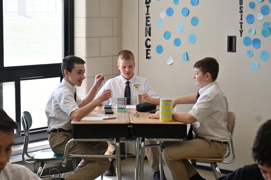 Pi Day, celebrated on March 14, fell on a Friday. So, while there was no actual pie for middle school students on a Friday in Lent, they did enjoy fun activities during math class for the occasion. Groups worked to calculate measurements of various circular objects provided by Mrs. Diffenderfer.