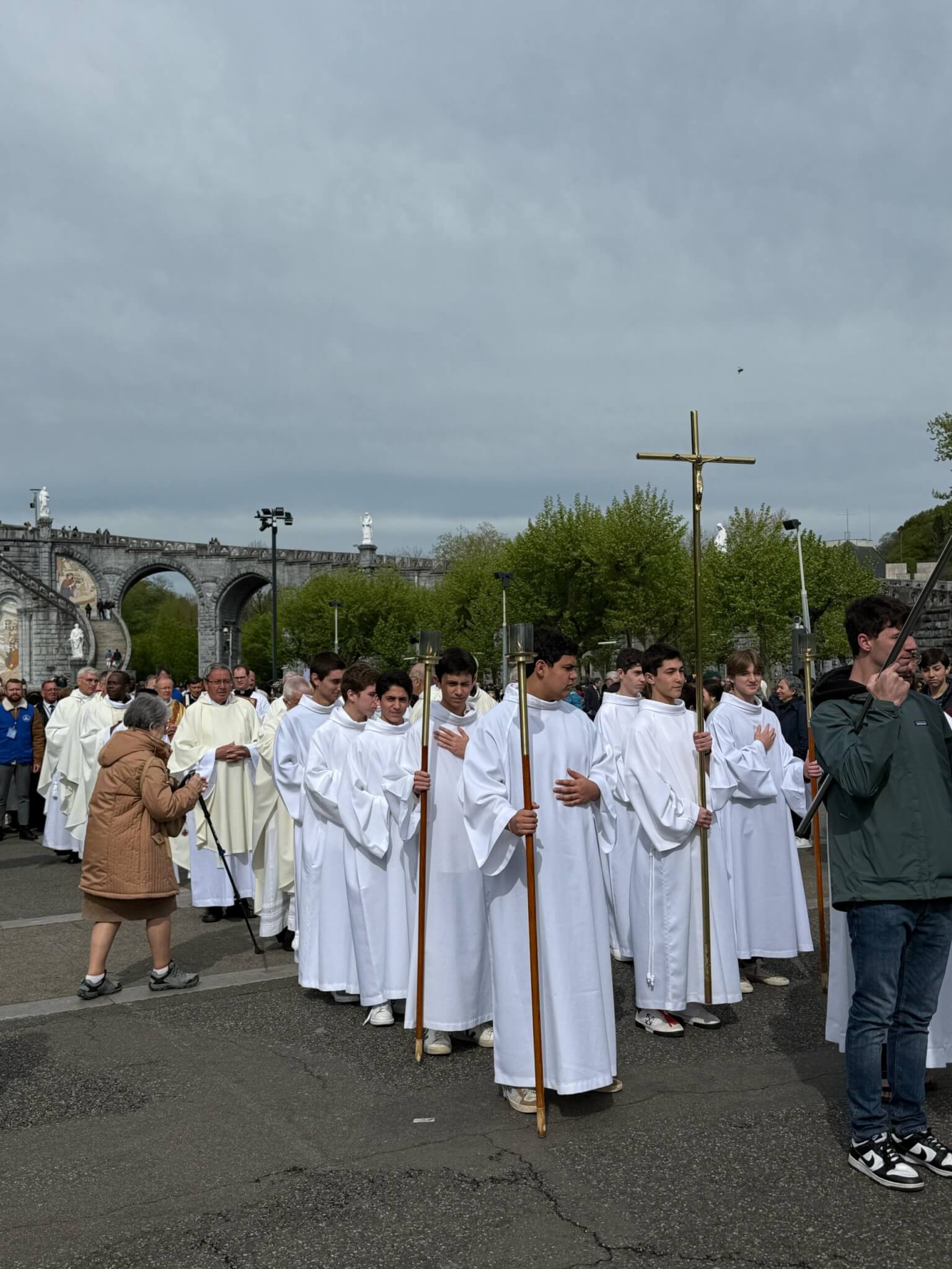 In Lourdes, the group was officially welcomed in the Easter Mass. The students also got to serve Mass, read petitions, and bring up the gifts in the Mass of 20,000 people in the Pius X Basilica. Click here for a video of the Mass. Click here for a video of the Eucharistic Procession. They also carried Our Lady and torches in the evening Marian procession. I don’t have the official videos of that yet