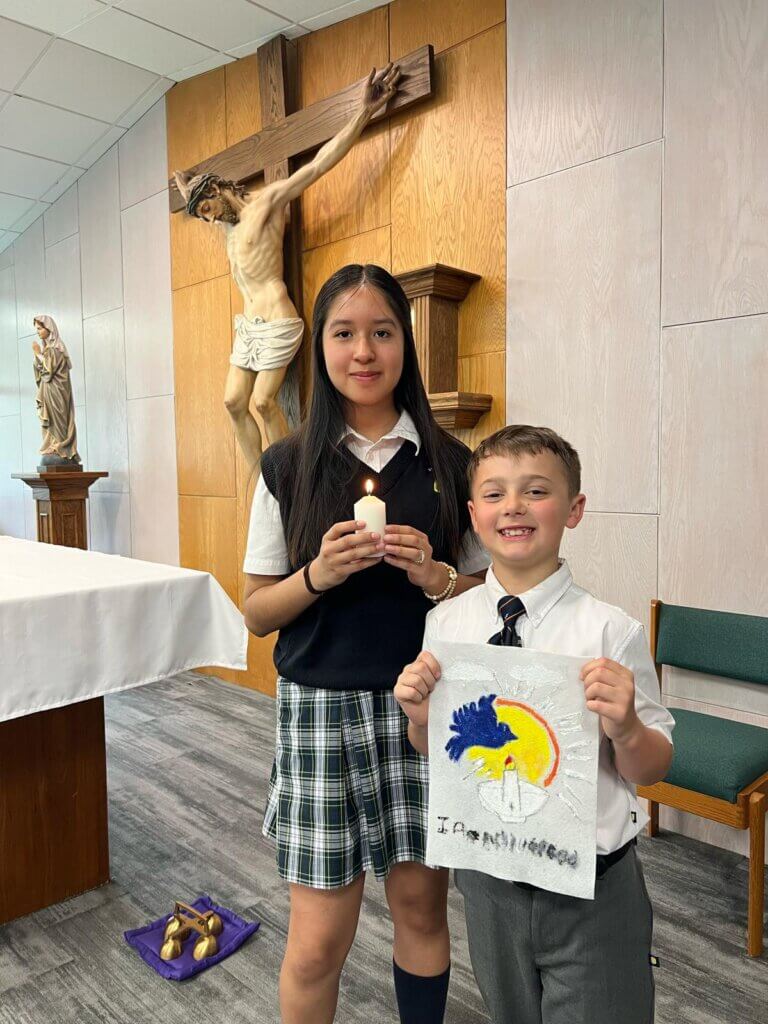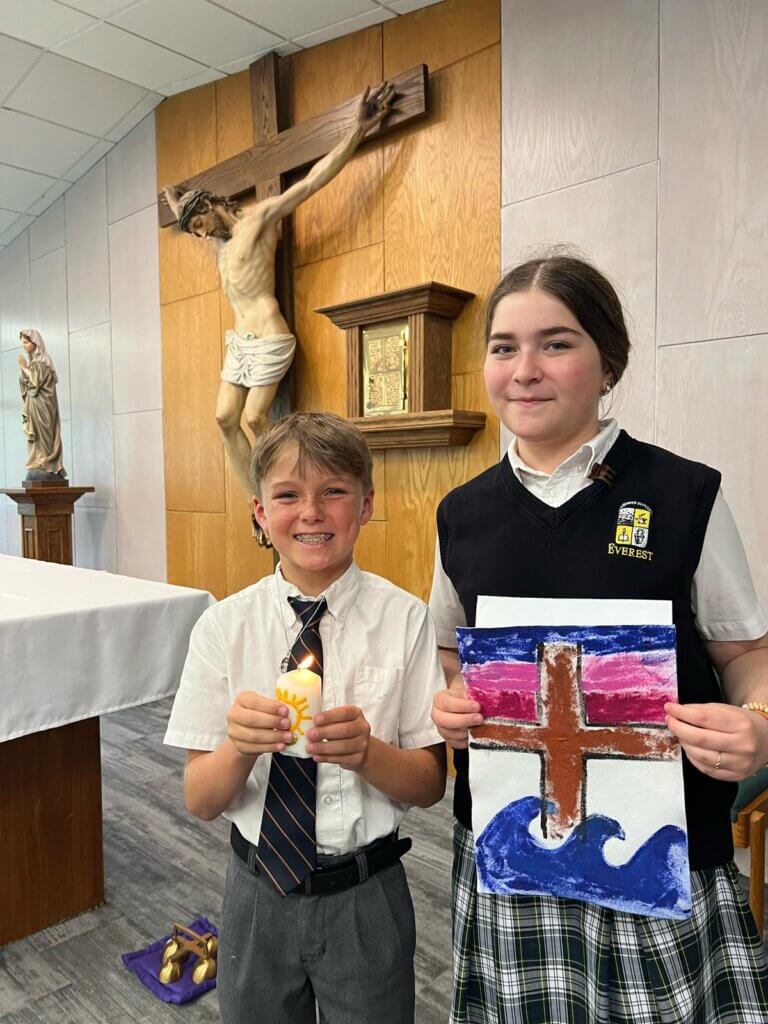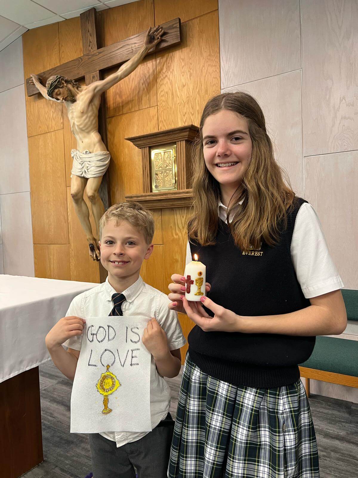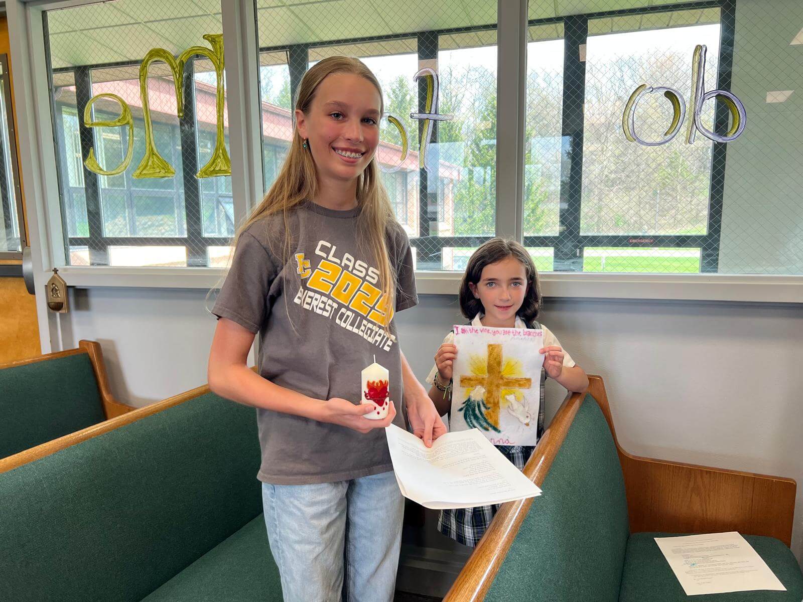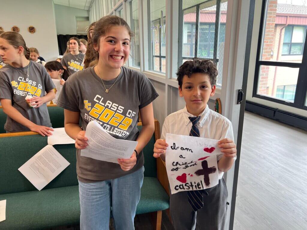 Throughout the school year, Everest students partner with younger students in their formation. From reading buddies to EC academy ed club, Catholic Schools Week activities, sacrament preparation, the Feast of the Guardian Angels, field day, and more. Eighth-grade girls have worked with second graders as they prepared for their First Holy Communion this year. They celebrated their Baptisms and upcoming reception of the Eucharist at a ceremony of garment and light.