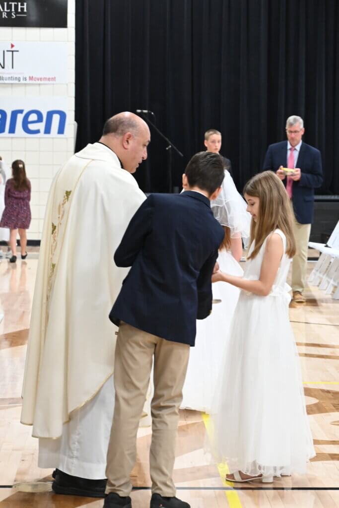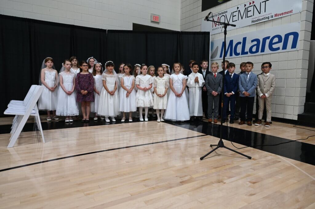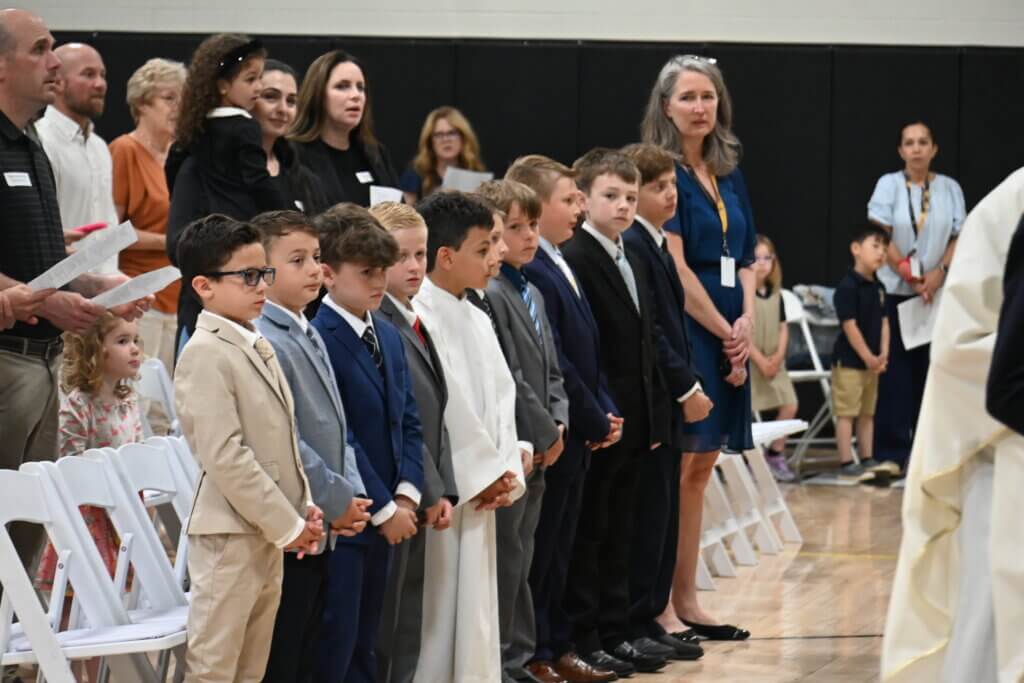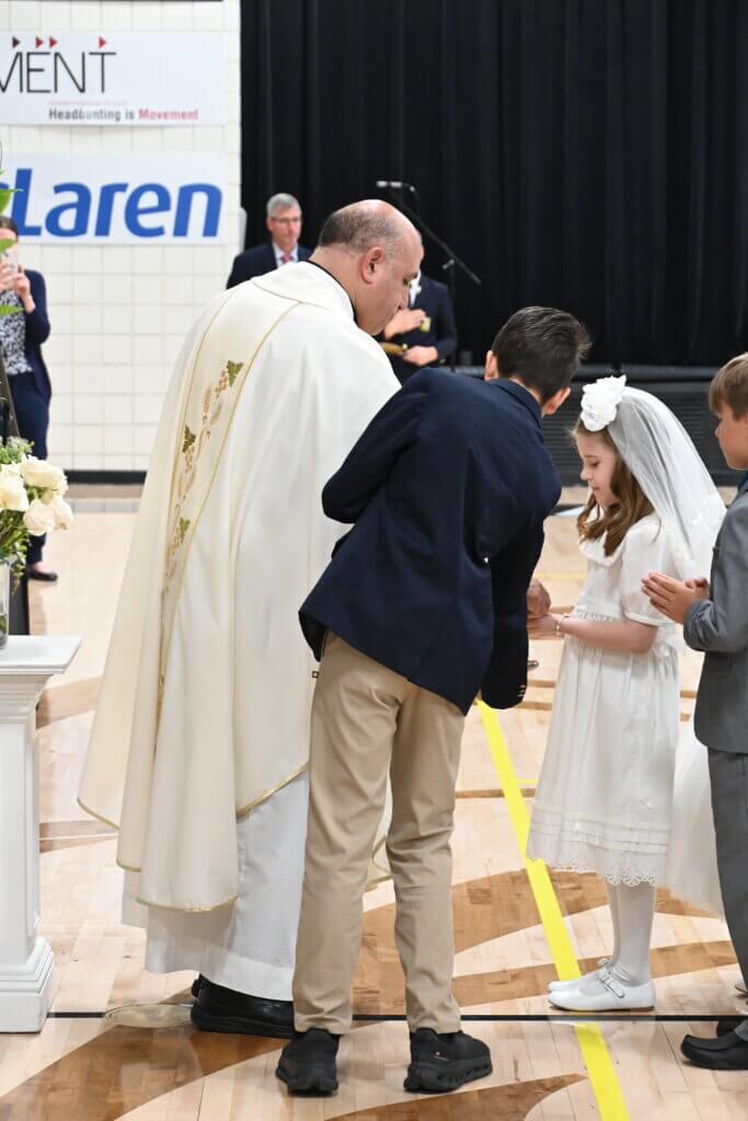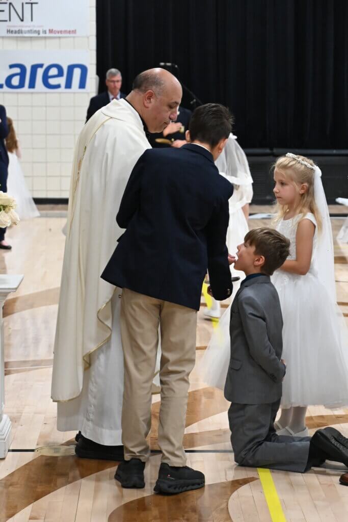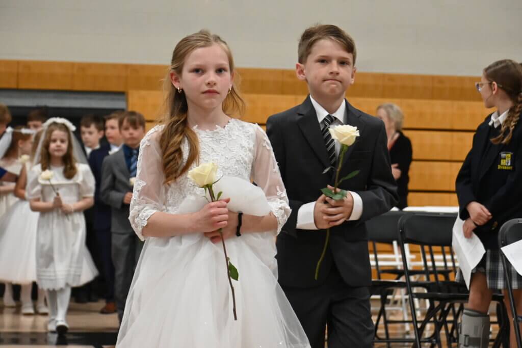 While every Everest student participates in sacramental preparation through the parish where he or she will receive a sacrament, religion classes focus on sacramental preparation in second grade. Following the students’ First Communions at their parishes, they are celebrated in a special way at school. Wearing their First Communion garb, they are honored at Mass. It is always a special moment when they sing Jesus, My Friend after communion.