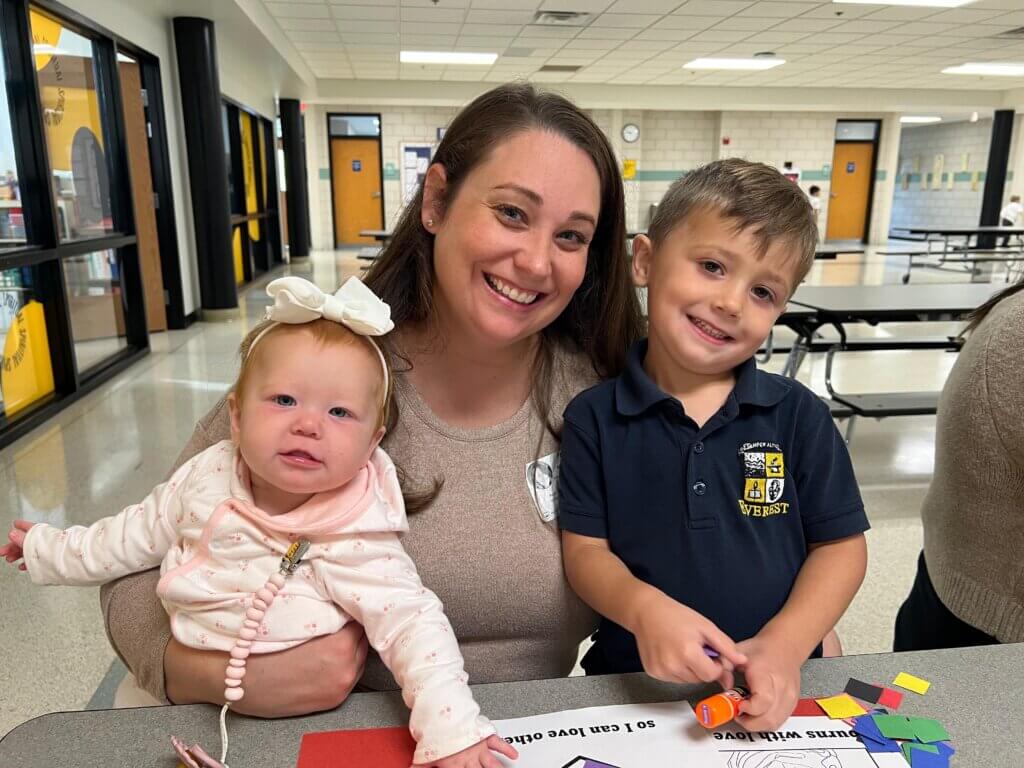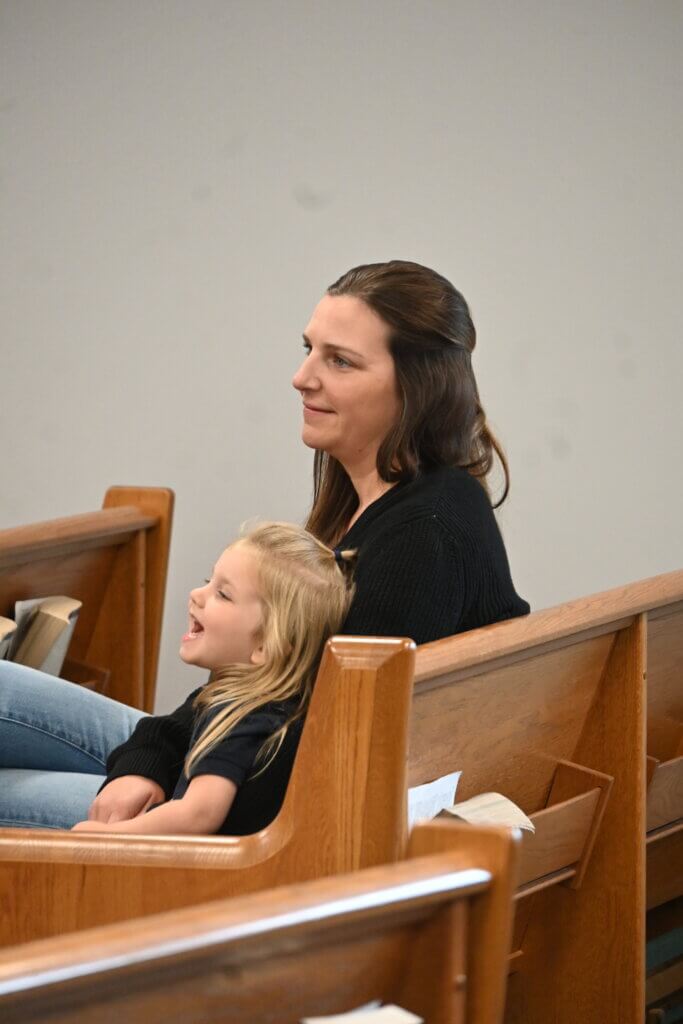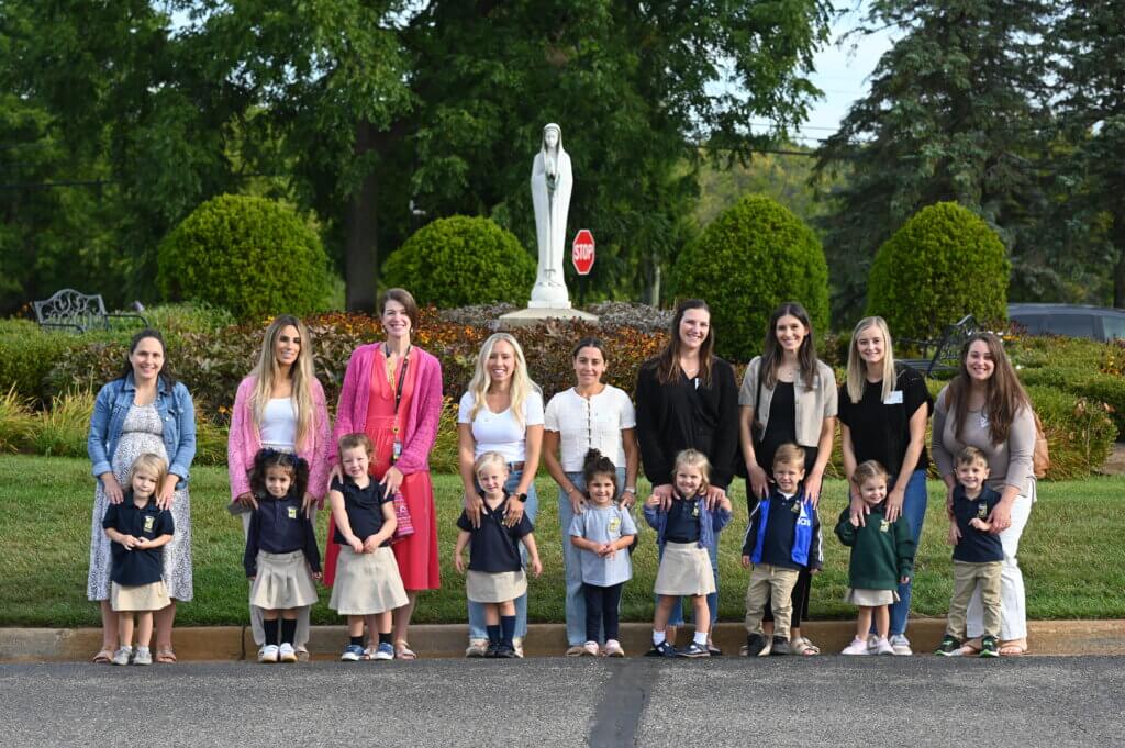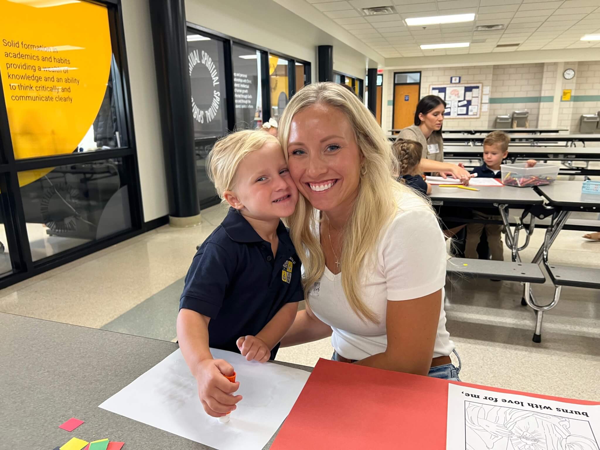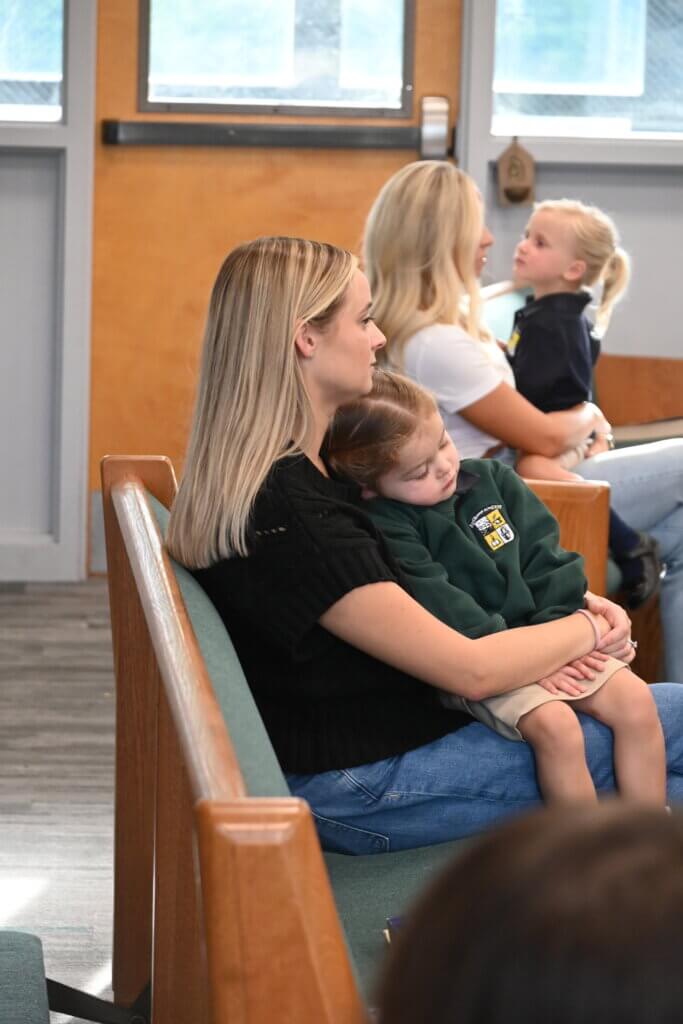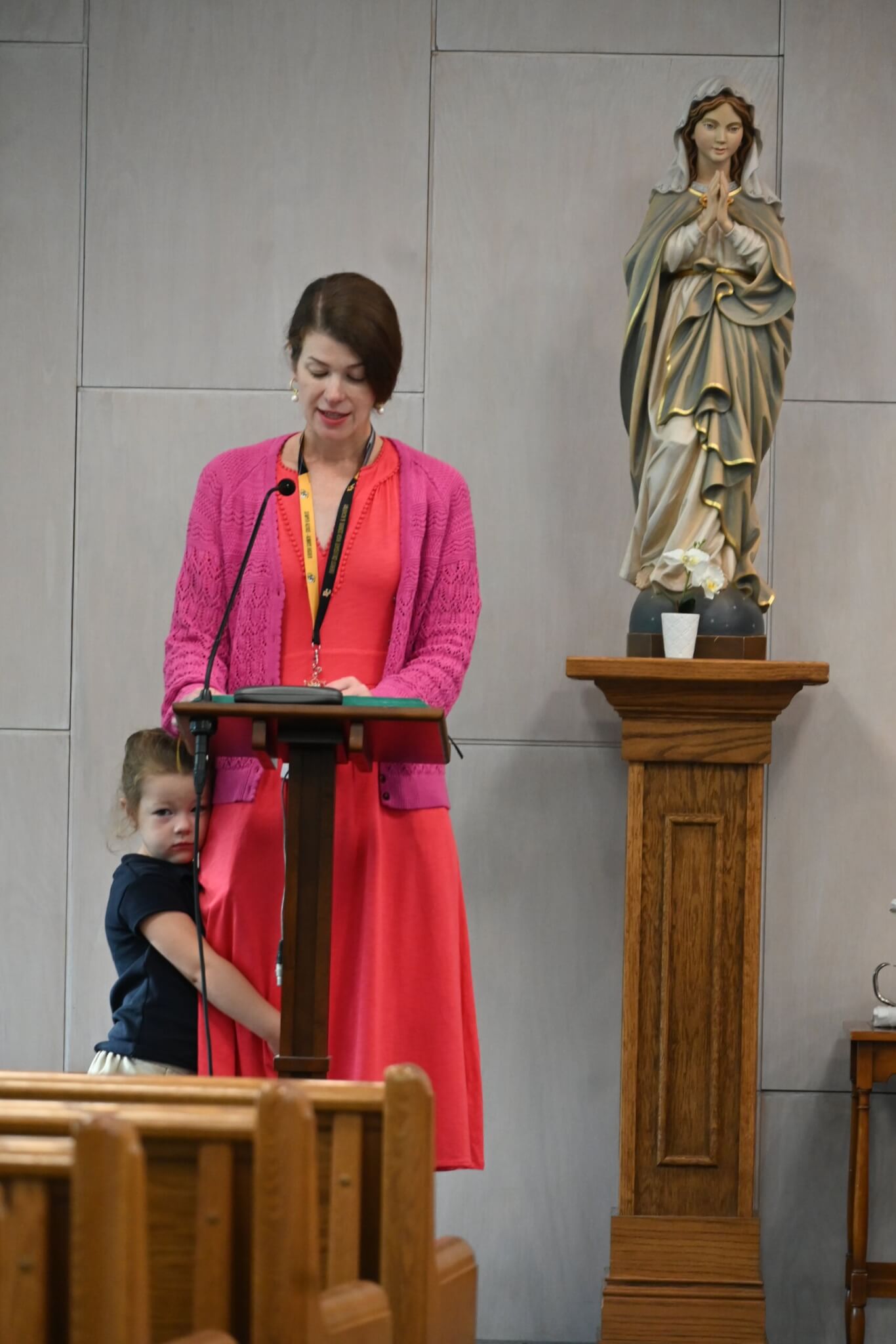 A part of the spiritual and family formation that Everest offers parents and students is the annual retreat program. From the youngest three-year-old Mountaineers to our graduating seniors, the annual retreat is a specific time to focus on faith and formation. The Preschool 3/4 class kicked off retreats for the year this past week. Mother and child retreats begin with Mass. The preschoolers were very excited to learn about Jesus’s home in the tabernacle. Fr. Thomas showed and explained to them how he gets vested for Mass and invited everyone to call to mind someone they would like to pray for throughout the Mass. After Mass they prepared a craft together to help us grow in the understanding of the virtue of charity. Then they has fun playing a game together, listening to the cues of when to walk, gallop, tip-toe, and run. Then the moms has some time to get to know each other and Miss Rose better.