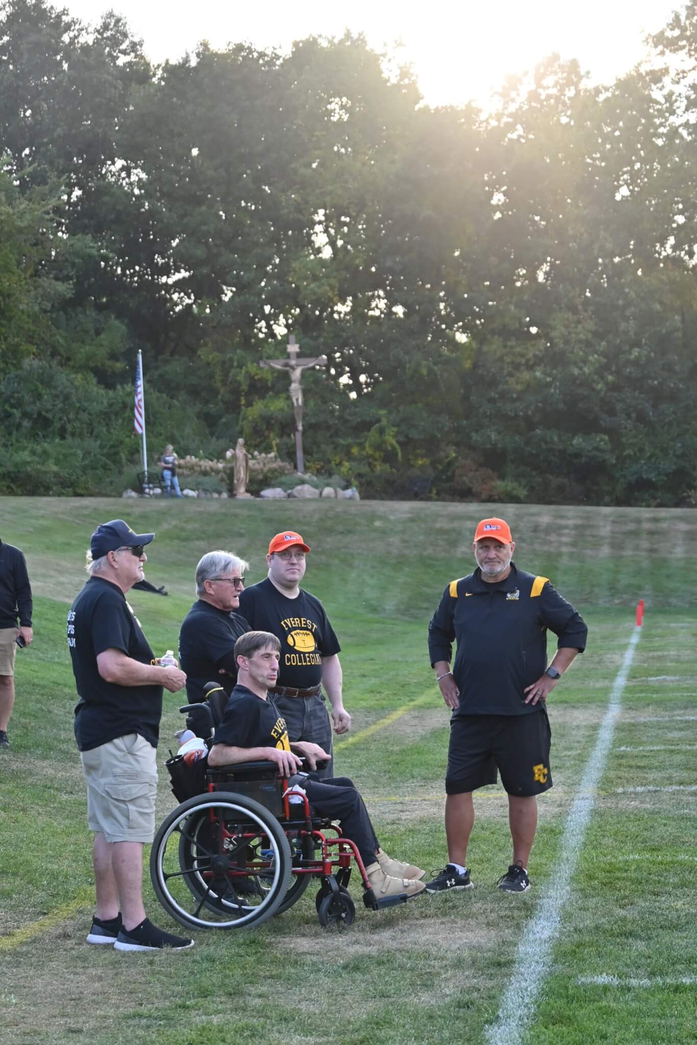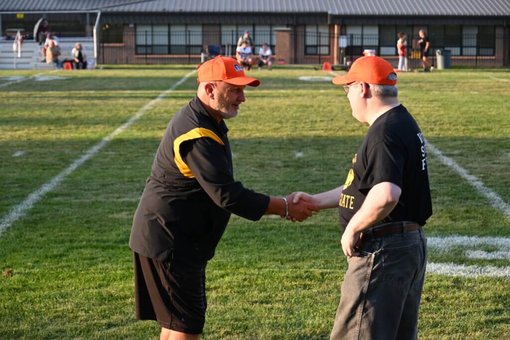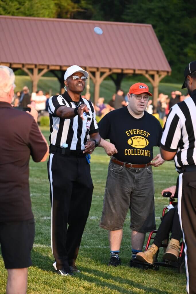 On Friday, September 12, EC football partnered with Drew’s Home of Clarkston for their home game against Riverview Gabriel Richard. The mission of Drew’s Home is to provide safe, accessible, and comfortable living conditions to enhance the lives of adults with disabilities. They provide integrated apartment-style residence for adults with disabilities. The Mountaineers held a returnable can/bottle drive to support Drew’s Home the night of the game. Drew’s Home residents, Drew Moscovic and Lewis Donaerandi, were honorary captains for the Mountaineers, participating in the coin toss before the Mountaineers 43-0 win.