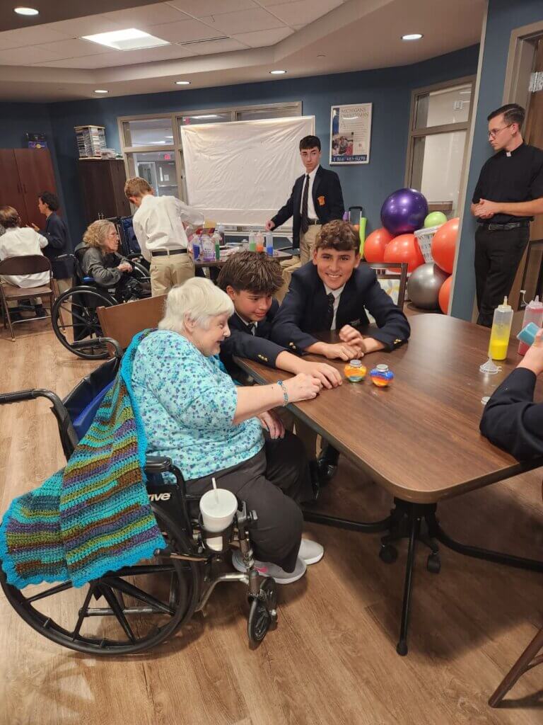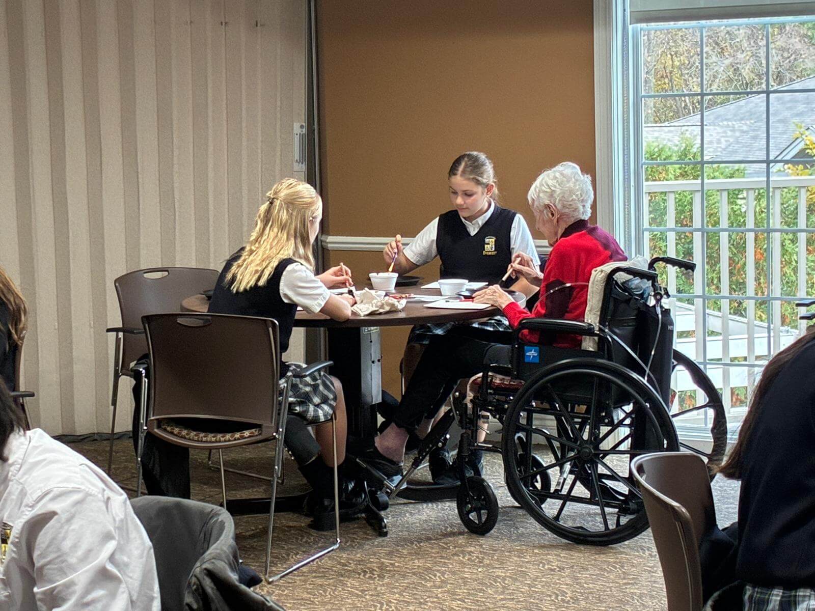 New this year, each of Everest’s middle school classes will participate in their own “Mountaineer Mission Day.” While middle school students have always participated in Everest’s apostolic formation, the formalization of Mountaineer Mission Days across grades PS-12, is new this school year. While opportunities to bring Christ’s love and joy to others are frequent throughout the year, this day is dedicated to service with their immediate peers and becomes a memorable experience for the students and those they serve. Seventh graders visited residents at Lourdes Senior Community. Together, they prayed the rosary and enjoys arts, crafts, and games.